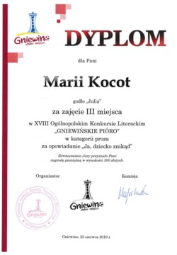 Laureat XVIII Ogólnopolskiego Konkursu Literackiego Gniewińskie Pióro